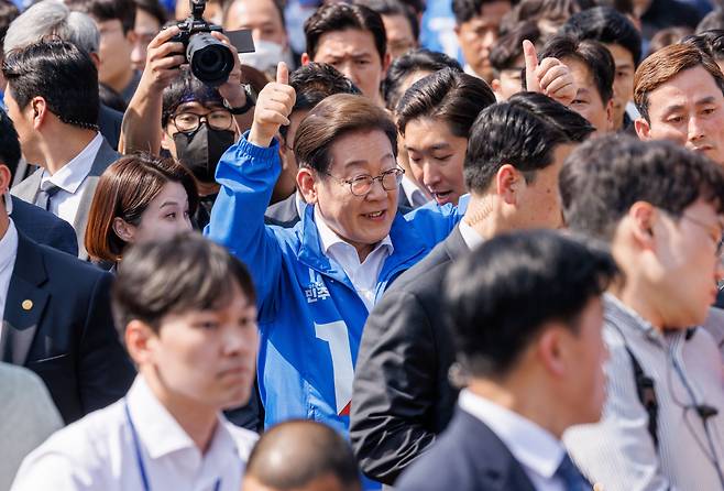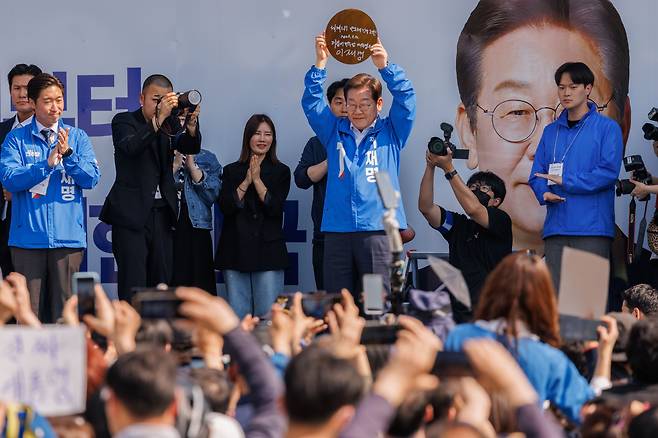 | ▲ 이재명 더불어민주당 대통령 후보가 12일 오후 경기 화성 동탄 센트럴파크 음악분수중앙광장에서 시민들에게 인사하며 유세장을 향하고 있다. |