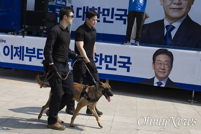 | ▲ 12일 오후 이재명 더불어민주당 대선후보가 12일 오후 경기도 화성시 동탄 센트럴파크 음악분수중앙광장에서 열린 ‘K-반도체' 동탄 집중유세에를 시작하기 직전 경찰관들이 폭발물 탐지견으로 수색을 하고 있다. |