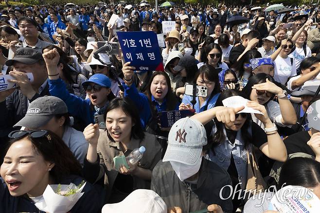 이날 이 후보 지지자들은 '이재명 우리 대통령', '국민1(일)꾼 이재명', '당신은 최고입니다'라고 적힌 손팻말을 들거나 파란 풍선을 흔들며 지지를 표했다. 이 후보가 한 문장씩 연설 내용을 말할 때마다 "이재명" 연호가 여기저기서 돌림노래처럼 이어졌다. 이들은 유세 트럭 주변에 모여 있거나, 햇빛을 피하기 위해 인근 벤치에서 유세를 지켜봤다.