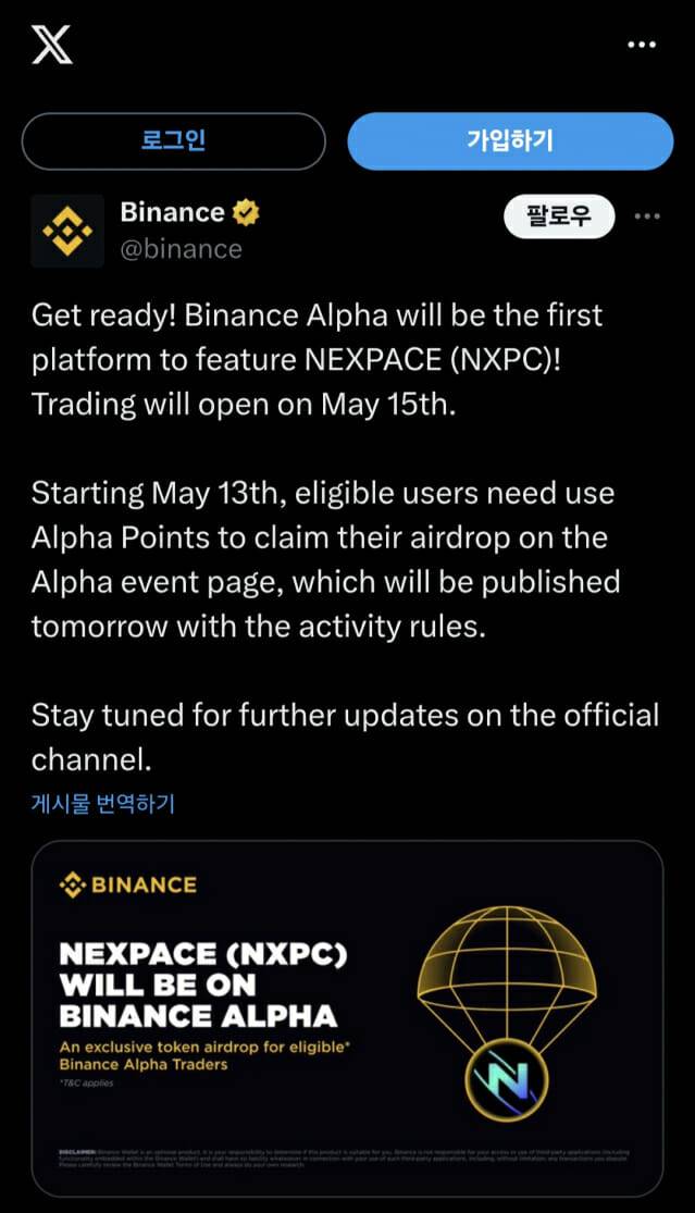 바이낸스는 공식 X(구 트위터) 채널을 통해 “바이낸스 알파는 NXPC를 최초로 상장하는 플랫폼이 될 것”이라며 “5월 15일부터 거래를 지원하고, 13일부터는 자격을 갖춘 사용자들이 알파 포인트를 사용해 NXPC 에어드롭을 신청할 수 있다”고 밝혔다.