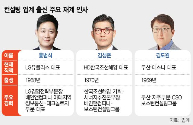 이 외에도 LG그룹은 홍범식 LG유플러스(032640) 대표이사가 컨설팅 출신으로 그룹에서 신임을 받아 올라온 인물로 꼽힌다. 홍범식 대표는 올리버와이만, 베인앤컴퍼니 등에서 정보통신기술 전문가로 활약하다가 구광모 LG그룹 회장이 발탁한 인사다. 지주사에서 경영전략부문장으로 LG그룹의 카카오 투자 등을 맡았으며 2024년부터 LG유플러스 대표로서 인공지능(AI)을 기반으로 한 성장동력을 발굴하고 있다.