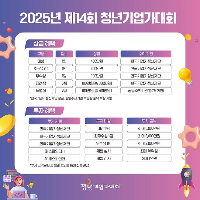 대상팀이 이들 기관에서도 투자를 받게 된다면 총 투자금액은 최대 11억5000만원이 된다. 다른 공동 주최기관에서의 투자유치 기회도 있다.