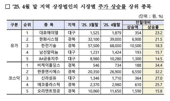 대구경북 상장법인 시장별 주가 상승률 상위종목. <한국거래소 대구혁신성장센터 제공>