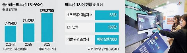 베트남 민영 통신사 FPT그룹의 시스템통합(SI) 계열사인 FPT소프트웨어는 올 2월 ‘국내 정보기술(IT)산업의 심장’으로 불리는 경기 성남시 판교에 사무소를 열었다. 2018년 한국에 첫 지사를 설립한 이후 벌써 네 번째 사무소다. 한국 내 직원만 12일 기준으로 350명에 육박한다. SI업계 관계자는 “베트남 대학들이 IT 학과를 집중적으로 키우고 있다”며 “한국어 능통자도 많아 한국의 IT 아웃소싱 시장에서 인도·중국 업체를 대체하는 사업자로 부상하고 있다”고 말했다.