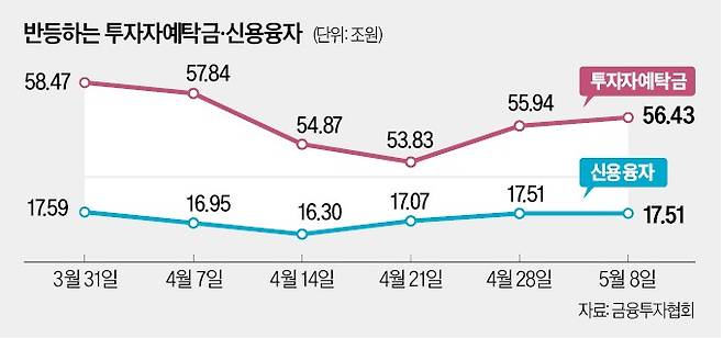 신용거래융자 잔액도 늘어나고 있다. 가장 최근 통계인 지난 9일 잔액은 17조5279억원이었다. 바닥을 찍은 지난달 14일(16조3045억원)에서 1조원 넘게 늘었다. 신용거래융자 잔액은 투자자가 증권사에서 돈을 빌려 주식을 산 금액의 합계다.