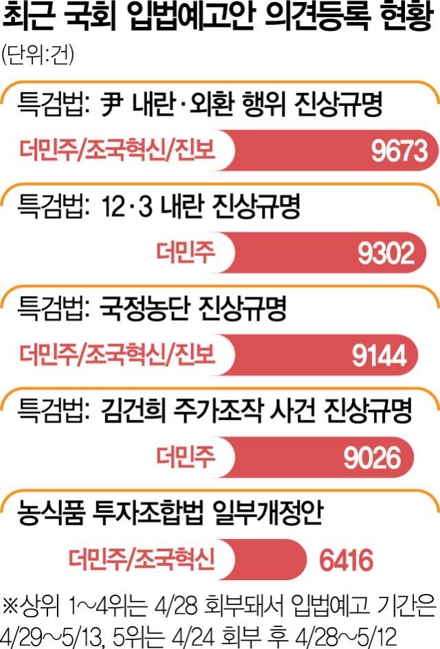이처럼 신속하게 입법예고안에 대한 피드백이 이뤄지는 배경에는 보수 단체의 조직적인 ‘야당 입법 저지’ 활동이 있다. 서울경제신문 취재에 따르면 현재 윤석열 전 대통령 지지자들이 모인 텔레그램, 카카오톡 메신저 방, 극우 성향 온라인 커뮤니티인 디시인사이드 ‘미국정치갤러리’, 각종 보수 유튜브 채널 게시판 등에서는 매일 ‘악법 목록’이 공유되고 있다. 상위 4개 법안 또한 모두 진보 성향 정당이 발의했거나 윤 전 대통령 및 김건희 여사와 관련한 특검법이었다.