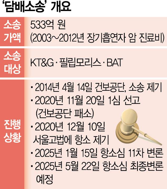 국민건강보험공단과 KT&G·필립모리스·BAT 등 담배회사 간 533억 원 규모의 '담배소송'이 12년째 장기간 이어지자 국민건강 차원에서 재판부가 판결을 내려야 한다는 목소리가 커지고 있다.