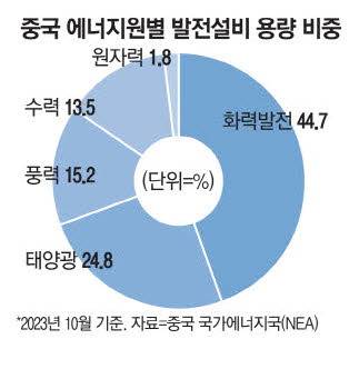 발전설비 용량 기준으로는 이미 저탄소 에너지가 화력발전을 따라잡았다. 중국 국가에너지국(NEA)에 따르면 2023년 10월 기준 중국의 총발전설비 가운데 55.4%가 수력·풍력·태양광·원자력과 같은 청정에너지로 나타났다. 특히 태양광이 전체 발전설비 용량의 24.83%를 차지해 청정에너지 중 가장 비중이 높았다. 그 외 풍력(15.22%) 수력(13.49%) 원자력(1.82%) 등이 뒤를 이었다.