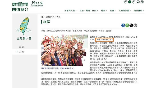 대만 행정원은 지난 3월 홈페이지에 올린 대만 민족구성 설명에서 '한족이 최대로 전체 인구의 96.4%를 차지한다'는 기존 문구를 삭제하고, '2.6%가 원주민으로 추산되며 외국인 1.2%, 기타인구는 96.2%'로 대체했습니다.
