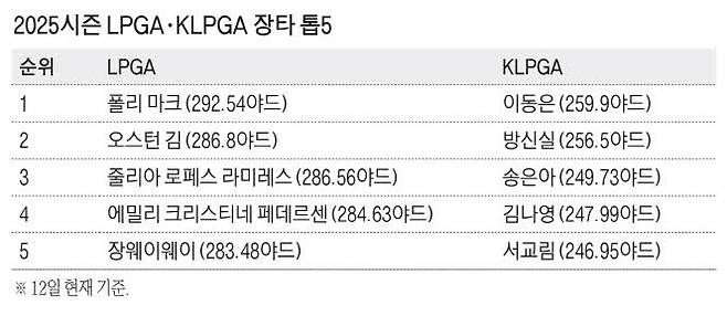 LPGA 투어와 달리 KLPGA 투어에서는 평균 270야드는 물론 250야드 이상 기록한 골퍼를 찾는 것도 드물다. 12일까지 2025시즌 7개 대회를 치른 가운데, 평균 드라이버샷 1위에 오른 이동은이 259.9야드를 기록했다. 이어 방신실이 256.5야드로 2위, 단 두 명만 평균 250야드 이상을 기록했다. 2013년 평균 260야드 이상 골퍼가 6명이나 됐지만 이제는 찾기가 힘든 실정이다.