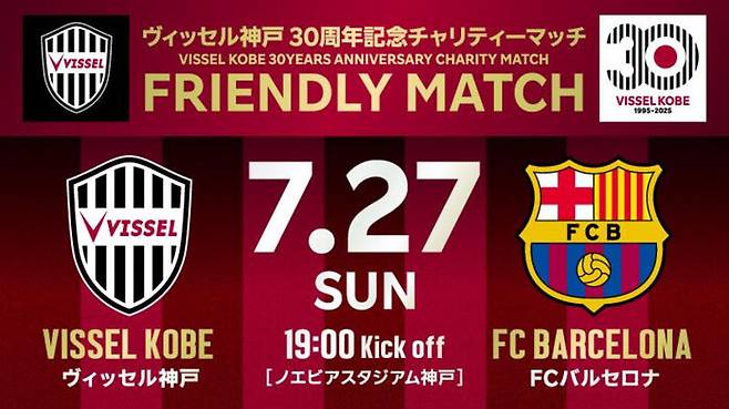고베는 창단 30주년을 기념하기 위해 오는 7월 27일 오후 7시 바르셀로나와의 자선경기를 개최한다고 발표했습니다.