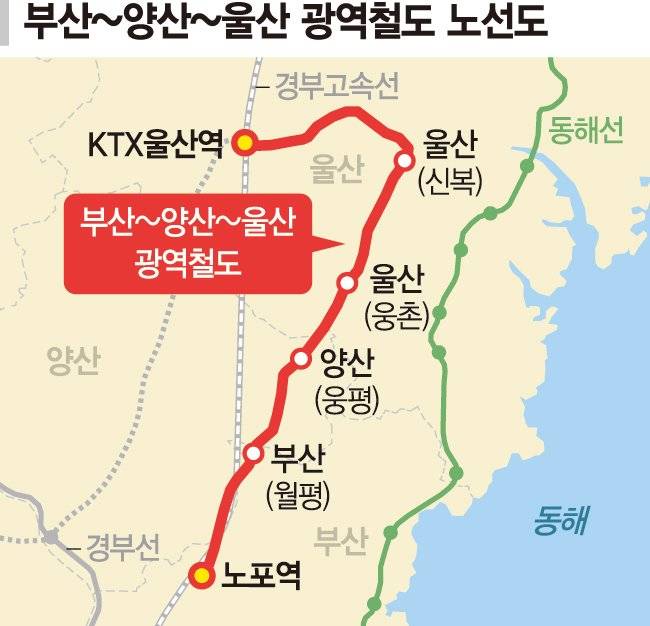 '울산~양산~부산 광역철도'는 지난 2021년 비수도권 광역철도 선도사업으로 선정됐다. 이 광역철도는 제4차 국가철도망 구축계획에 반영됐다. KTX 울산역을 출발, 양산 웅상을 거쳐 부산 노포역까지 연결되며 총사업비는 3조424억원이다. 지난해 6월 예비타당성 조사에 착수했으며 오는 6월에 결과가 나올 예정이다.