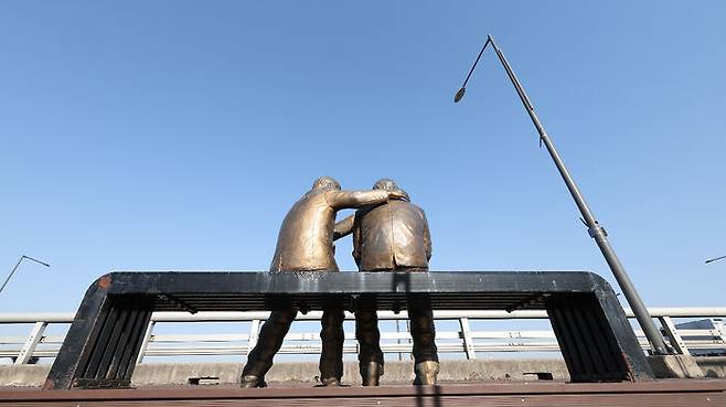 ▲ 2월 27일 오후 서울 마포대교에 자살 예방을 위한 '한 번만 더' 동상이 설치돼 있다.