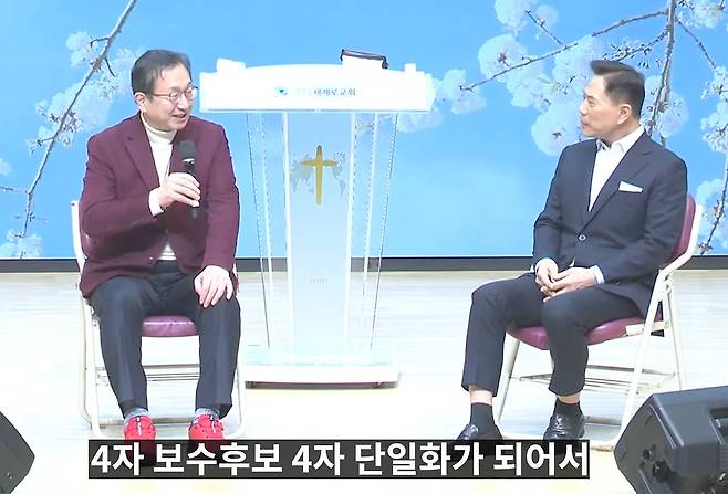 | ▲ 지난 3월 16일 부산 세계로교회 유튜브에 올라온 정승윤 부산교육감 재선거 후보와 손현보 담임목사의 교회 내 마이크를 이용한 대담 영상. |