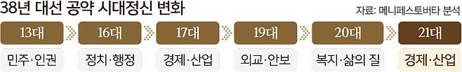13대 대선 이후 주요 후보들의 1호 공약을 분석한 결과, 김영삼 전 대통령의 문민정부가 출범한 14대 대선 당시에는 ‘정치·행정’이 시대정신으로 부상했고, 김대중 전 대통령이 당선됐던 15대 대선에서는 ‘민주·인권’, ‘경제·산업’과 함께 ‘복지·삶의 질’이 처음으로 주요 비중으로 제시됐다. 이어 노무현 전 대통령이 당선된 16대 대선에서는 지방분권과 정부 역할론이 강조되면서 ‘정치·행정’이 최대 화두로 부상했다.