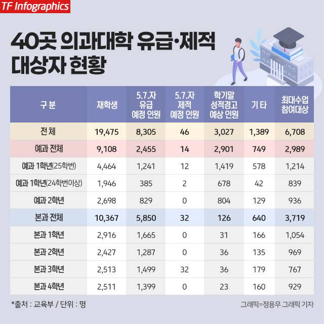 교육부는 지난 9일 40곳 의대 유급 대상자는 8305명이라고 밝힌 바 있다. 전체 의대생 1만9475명의 42.6%에 해당한다. 유급 대상자 중 예과 1학년은 총 1626명(25학번 1241명·24학번 이상 385명)이다.