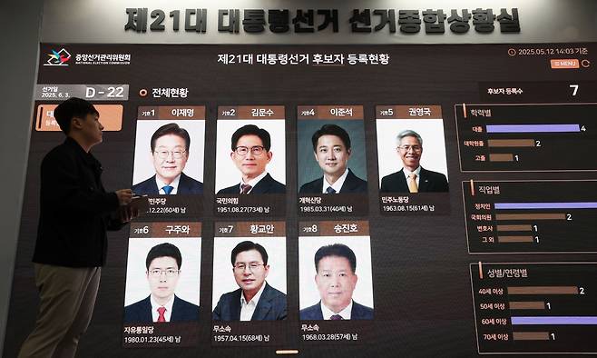 | 7人의 대선후보 제21대 대통령선거 공식 선거운동이 시작된 12일 경기 과천시 중앙선거관리위원회에 마련된 종합상황실 전광판에 대선 후보자들의 사진이 게시돼 있다. 과천=이제원 선임기자 |