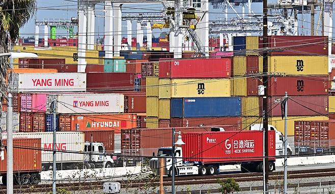 | ▲ 2025년 3월 4일 캘리포니아 롱비치 항구에 선적 컨테이너가 높이 쌓여 있다. |