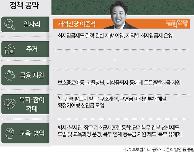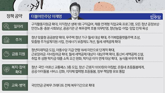 민주당 이 후보는 자신의 대표 정책인 ‘기본소득’형 공약이 다수였다. 청년내일채움공제 시즌2라며 발표한 ‘청년미래적금’은 이 후보의 대표적인 현금성 지원 공약이다. 청년내일채움공제는 중소기업에서 오래 일한 청년에게 성과보상금 형태로 지원금을 지급하는 제도다. 이외에도 아동수당 지급 연령을 18세 미만으로 단계적으로 확대하거나, 청년의 국민연금 생애 첫 보험료를 국가가 지원하는 방안. 또 자발적 이직 청년에게 생애 1회 구직급여를 지급하는 등 소득보장체계를 구축하는 공약을 내세웠다.