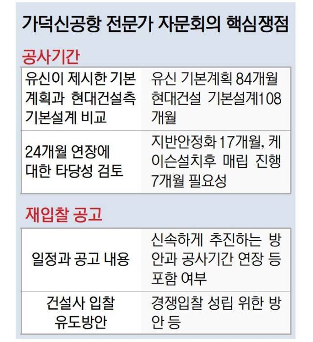 전문가 자문회의에서 가장 중요한 점은 가덕신공항 부지 조성 공사 기간을 어떻게 산정하느냐다. 공사 기간이 실제로 부족한지 여부에 대한 면밀한 검토가 이뤄질 전망이다. 아울러 이와 관련해 향후 재입찰에 들어갈 경우, 경쟁입찰이 이뤄지도록 건설사들이 관심을 환기시킬 수 있는 방안도 논의된다.