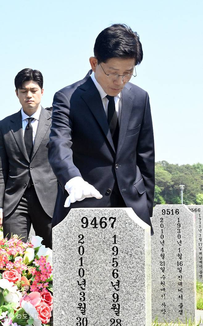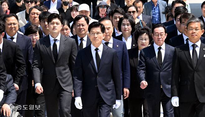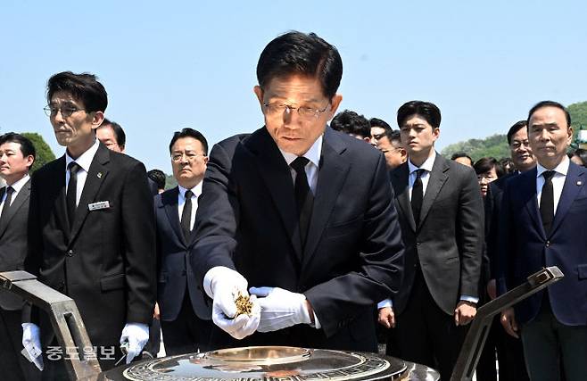 국민의힘 김문수 대선 후보가 12일 대전 유성구 국립대전현충원을 찾아 참배를 하고 있다. 이성희 기자 token77@