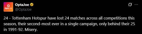 축구 통계 매체 ‘옵타(Opta)’의 공식 SNS 계정 ‘OptaJoe’는 12일 “토트넘은 이번 시즌 모든 대회를 통틀어 24패를 기록했으며, 이는 단일 시즌 기준 구단 역사상 두 번째로 많은 패배다. 최다 패배는 1991-92시즌의 25패였다”며 “그야말로 비참함 그 자체”라고 전했다.