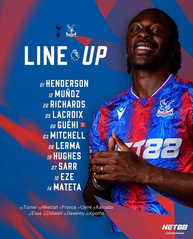 이에 맞서 팰리스의 올리버 글라스너 감독은 3-4-2-1 포메이션으로 응수했다. 딘 헨더슨이 골키퍼로 나섰고, 마크 게히, 막상스 라크루아, 크리스 리차즈가 스리백을 형성했다. 미드필드에는 타이릭 미첼, 헤페르손 레르마, 윌 휴즈, 다니엘 무뇨스가 배치됐고, 2선에는 에베레치 에제와 이스마일라 사르가 나서 최전방의 장필리프 마테타를 지원했다.