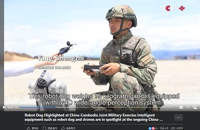 | ▲ 지난해 캄보디아에서 열린 캄보디아-중국 군사합동 훈련장에 첫 투입된 군사용 로봇 개에 대해 소개하는 중국 CCTV 동영상 중 한 장면. 주캄보디아중국대사관 공식 페이스북에도 이 영상이 올라와 있다. |