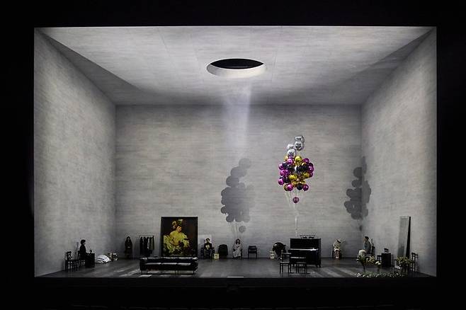 무대 세트는 현대적인 세련미를 추구했다. 마치 거대한 상자 속에 들어온 듯하다. 무채색의 차가운 공간은 헤다의 공허하고 억압된 심리는 물론 작품 특유의 서늘한 분위기를 조성한다.