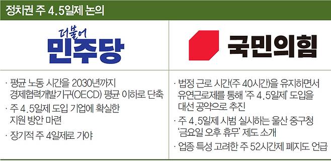 국민의힘 안은 쉽게 말해 유연근로형 4.5일제다. 가령 월요일부터 목요일까지 하루 1시간씩 더 일하고 금요일에 4시간만 근무하는 형태다. 법정 근로 시간(주 40시간)엔 변화가 없다. 이 방식은 이미 대기업을 중심으로 몇몇 기업이 시행 중이다. 국민의힘은 더 많은 일터에서 주 4.5일제를 활용하도록 저변을 높이겠다는 게 핵심이다. 노동 시간을 줄이지 않고 주 4.5일제를 구현하는 방식이다.