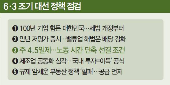 권 위원장 말대로 민주당 안은 고려해야 할 점이 적지 않다. 민주당 안의 핵심은 ‘임금 삭감 없는 근로 시간 단축’이다. 이 경우 기업 비용 증가가 따른다. 줄어드는 근로 시간만큼 사람을 더 뽑거나 추가 수당을 지급해야 한다. 이 후보는 주 4.5일제 도입 기업에 대한 ‘확실한’ 지원이라는 당근책을 내세웠지만 구체적인 내용은 없다.