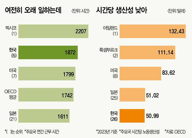 이런 현실이다 보니 한국은 장시간 근로에도 불구하고 생산성이 높지 않다. OECD에 따르면 우리나라의 시간당 노동생산성은 50.99달러다. 아일랜드(132.43달러), 룩셈부르크(111.14달러)는 물론 미국(83.62달러), 일본(51.02달러) 대비 현저히 낮다. 한국의 노동생산성은 OECD 34개국 중 26위다(2023년 기준).