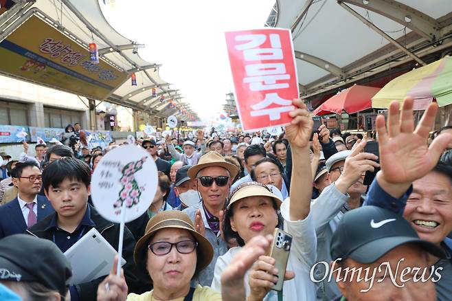 이날 오후 야구 유니폼을 연상케 하는 유세복을 입고 서문시장을 찾은 김 후보는 많은 인파에 고무된 듯 음악에 맞춰 춤을 추기도 했고 시민들로부터 받은 꽃다발을 들어 보이기도 했다. 또 어린 아이를 안은 뒤 손을 들어 인사하기도 했다.
