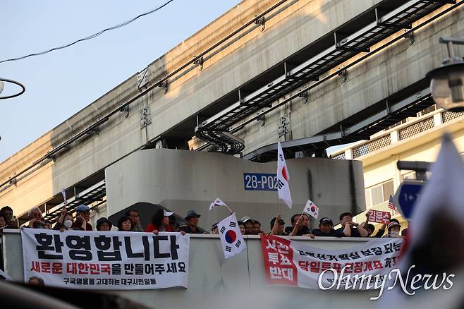 | ▲ 제21대 대선 선거운동 첫날인 12일 오후 김문수 국민의힘 후보가 대구 서문시장을 찾자 일부 지지자들이 육교 위에서 김 후보의 유세를 들으며 태극기를 흔들고 있다. |