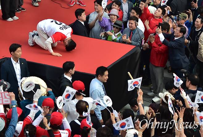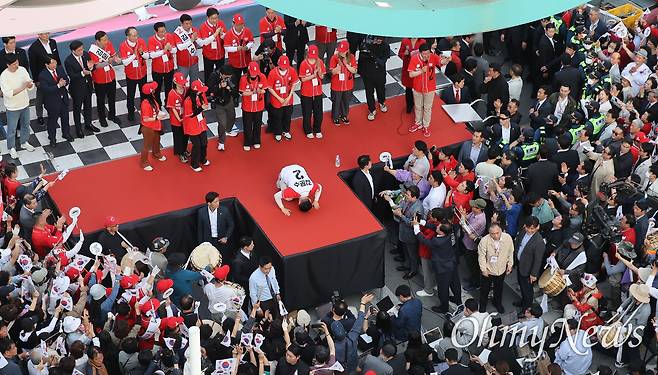| ▲ 김문수 국민의힘 대선후보가 12일 오후 대구 중구 서문시장에서 열린 유세에서 시민들에게 큰절을 드리며 지지를 호소하고 있다. |
