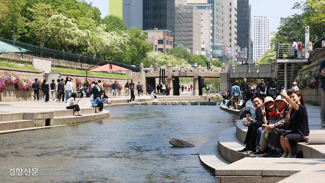 서울의 낮 최고 기온이 24도까지 오른 12일 서울 종로구 청계천을 찾은 시민들이 물가에 앉아 쉬고 있다. 기상청은 이번주는 대체로 맑고 낮에는 초여름 같은 날씨가 이어진다고 예보했다.