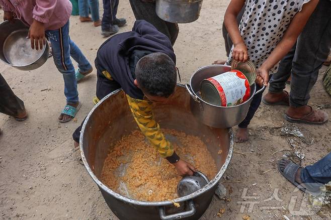 (가자 시티 AFP=뉴스1) 권영미 기자 = 12일(현지시간) 팔레스타인 가자시티의 이슬람대학 캠퍼스에서 자선단체가 제공한 음식 냄비 바닥을 한 소년이 긁고 있다. 2025.05.12.