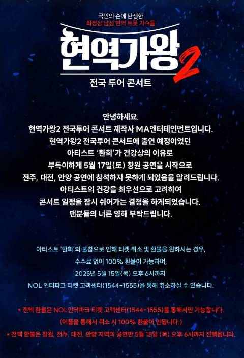 ‘현역가왕2’ 전국투어 콘서트 제작사 MA엔터테인먼트는 12일 공식 입장을 통해 “환희가 건강상의 이유로 부득이하게 5월 17일(토) 창원 공연을 시작으로 전주, 대전, 안양 공연에 참석하지 못하게 됐다”고 밝혔다. 이어 “아티스트의 건강을 최우선으로 고려해 콘서트 일정을 잠시 쉬어가는 결정을 내렸다. 팬분들의 넓은 양해를 부탁드린다”고 전했다.