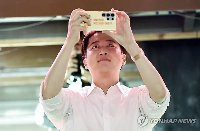 (서울=연합뉴스) 윤동진 기자 = 개혁신당 이준석 대선 후보가 제21대 대통령 선거 공식 선거운동 첫날인 12일 서울 청계광장에서 열린 출정식에서 연설을 마친 후 사진을 찍고 있다. 2025.5.12