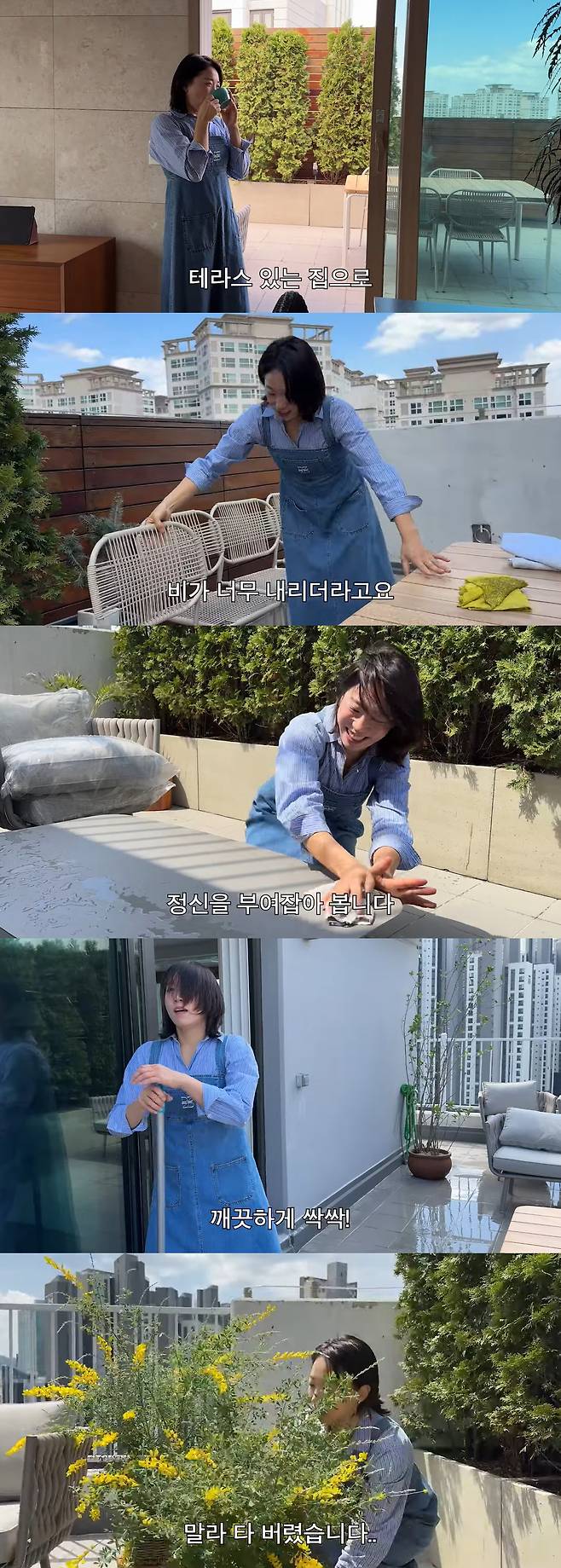 이미도는 "정신을 부여잡고 우아하게 하루를 시작해 본다. 고심해서 고른 가구들인데 배송이 오자마자, 비닐을 뜯기도 전에 비가 너무 내리더라. 먼지 실화인가!"라며 빗물, 먼지로 쌓인 테라스 가구를 보고 경악했다.