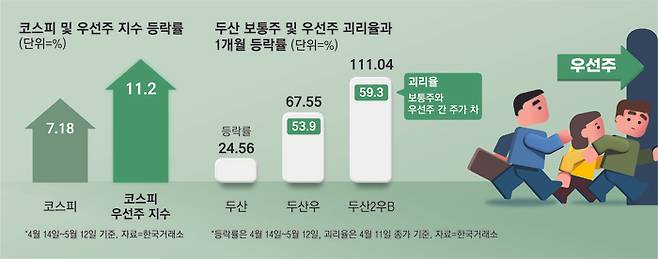 이 기간 두산우와 두산2우B도 각각 67.55%와 111.04%의 높은 상승률을 나타냈다. 두산 보통주는 24.56% 오르는 데 그치면서 우선주 상승폭이 2배에서 3배 이상 높았다.