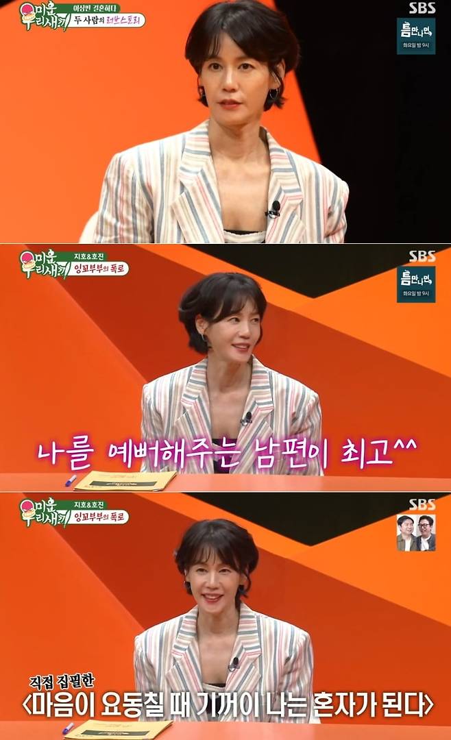 김지호는 지난 11일 방송된 SBS 예능 ‘미운 우리 새끼’에서 남편 김호진에 대한 돈독한 신뢰와 애정을 드러냈다.