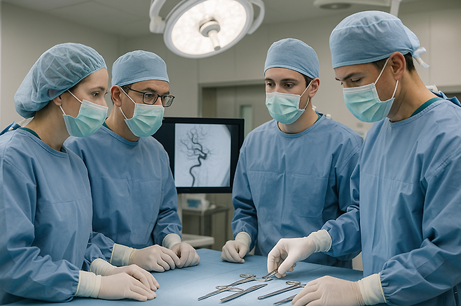 의료 현장에서 고난도 수술에 나선 뇌혈관 전문병원 의료진들이 수술 준비 중 진지하게 의견을 나누고 있다. 지난해 의정 갈등으로 상급병원의 기능이 마비된 가운데, 에스포항병원 등 전국 4곳의 뇌혈관 전문병원이 뇌출혈·뇌경색 환자 수술을 떠맡으며 필수의료의 최전선을 지켰다. 그러나 정부는 이들 병원을 '필수특화 기능 강화 사업' 대상에서 제외할 계획이어서 형평성 논란이 커지고 있다.<영남일보 AI 제작>