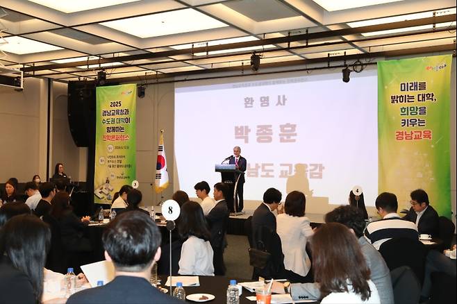 경상남도교육청(교육감 박종훈)은 12일 서울 나인트리 프리미어 로카우스 호텔에서 ‘경남교육청과 수도권 대학이 함께하는 진학 콘퍼런스’를 개최했다. 이번 행사는 수도권 26개 대학 입학 관계자와 경남지역 고등학교 3학년 부장교사, 진학 상담 교사 등 100여 명이 참여해 입시 정보 교류와 진학 전략 공유의 장을 마련했다.