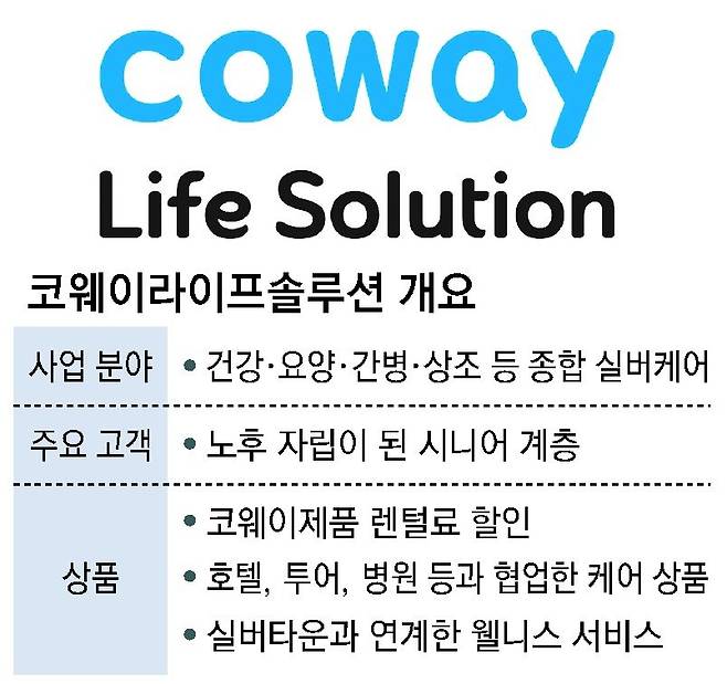 코웨이라이프솔루션은 프리미엄 실버케어를 표방한다. 건강, 요양, 간병, 상조 등 노후 준비에 더해 결혼, 여행, 반려동물 케어 등 삶의 순간마다 전문가의 도움이 필요한 시점에 맞춰 상품을 선택하고 전환할 수 있는 구조다.