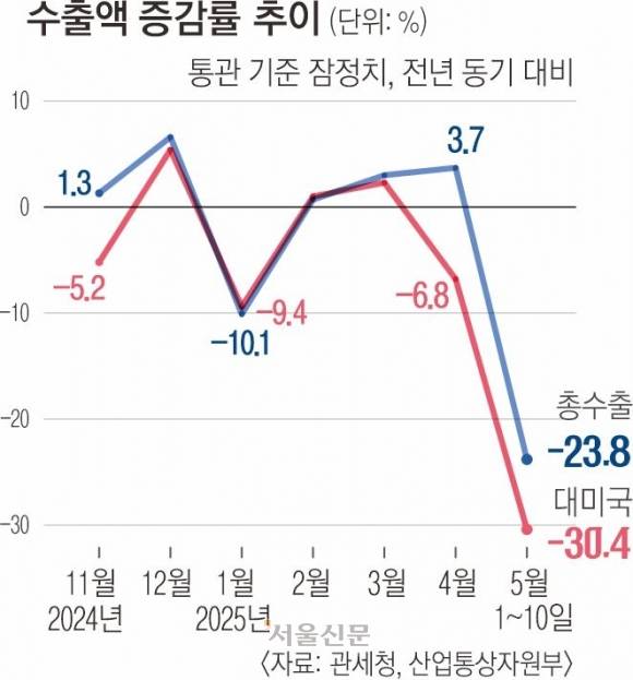 12일 관세청에 따르면 이달 1~10일 수출액은 128억 달러(약 18조원)로 지난해 같은 기간보다 23.8% 줄었다. 10대 주요 수출 품목 중 아직 관세가 부과되지 않은 반도체만 14.0% 상승했을 뿐 승용차(-23.2%), 석유 제품(-36.2%), 철강 제품(-41.2%), 선박(-8.7%), 자동차 부품(-42.6%) 등 9개 품목 모두 마이너스다. 자동차·철강에 부과된 품목별 관세 25%의 영향으로 자동차 최대 수출국인 미국 수출액이 30.4% 급락했다. 세계 경기가 위축되면서 대중국(-20.1%), 대유럽연합(-38.1%) 수출액도 큰 폭으로 떨어졌다.