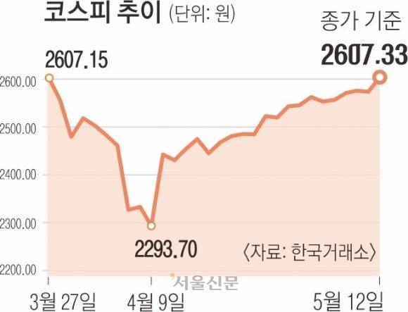 12일 코스피는 전 거래일 대비 1.17% 오른 2607.33으로 거래를 마쳤다. 종가 기준으로 지난 3월 27일(2607.15) 이후 46일 만에 2600선을 탈환했다. 코스닥도 전 거래일 대비 0.4% 상승한 725.40으로 장을 마감했다.