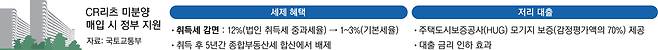 문제는 정부가 투자자 확보를 위해 CR리츠에 제공하는 금리와 세제 혜택이 이 경우에도 제공된다는 점이다. 주택도시보증공사(HUG)는 CR리츠에 모기지 보증(감정평가액의 70%까지)을 제공해 PF 대출보다 낮은 금리로 대출을 지원한다. 주택 취득 시 세금도 감면된다. 법인의 취득세 중과세율은 12%지만, CR리츠에는 기본세율인 1~3%만 적용한다. 취득 후 5년간은 종합부동산세 합산에서도 배제한다.