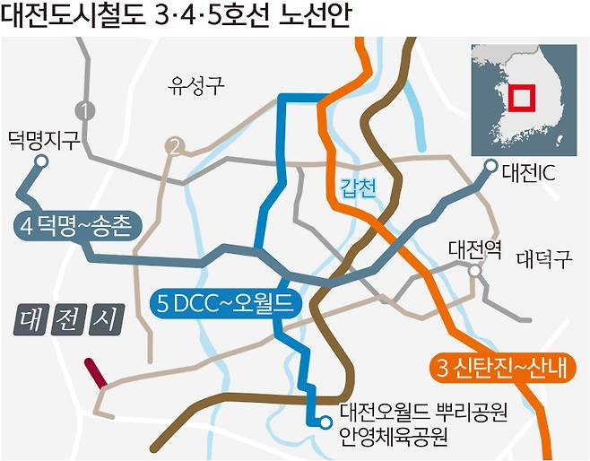12일 계획안에 따르면 3호선은 대덕, 유성, 서구, 중구, 동구를 남·북축으로 연결하는 29.2㎞에 달하는 노선이다. 주요 경유지로는 신탄진역-대덕테크노밸리-탑립전민산업단지-DCC네거리-문전네거리-중앙로역-충무로네거리-산내동으로 연결된다. 사업비는 8285억원에 이른다. 대전지역 동서를 가로지르게 될 4호선은 덕명지구-학하지구-도안지구-오룡역-대전복합터미널-동부네거리 경유하는 총연장 19㎞ 구간으로 5589억원의 사업비가 투입된다. 남북을 연결하게 될 5호선은 컨벤션센터네거리-정부청사-안골네거리-변동오거리-도마네거리-오월드를 경유하는 13.2㎞ 구간에 3885원의 예산이 소요된다. 5호선은 대전컨벤션센터에서 오월드까지 이어지는 노선으로 대전 서구 및 중구 서측 주민의 도시철도 접근성 강화와 오월드 이용객의 대중교통 편의성을 높이는 노선이라는 설명이다. 3∼5호선 건설사업비만 1조8000억원에 달한다.