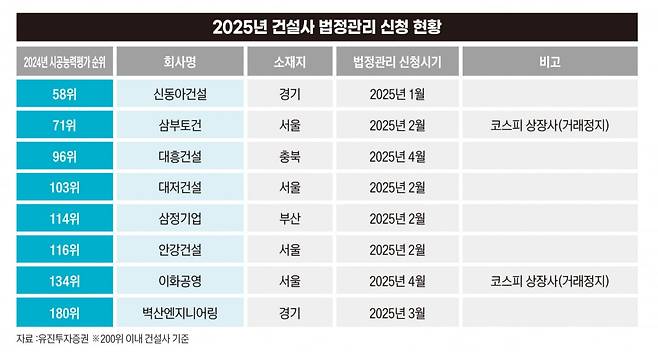 연초 시공능력평가 58위 신동아건설의 법정관리 소식 이후 올해만 8개 200위권 내 국내 건설사가 기업회생절차를 신청했다. 4월에는 충북 1위 건설사인 대흥건설도 법정관리 리스트에 이름을 올렸다.